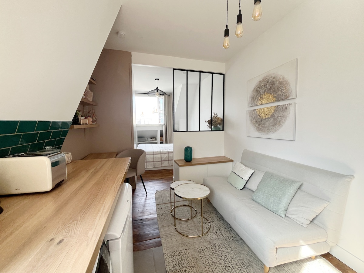 1 bedroom 6th floor (with elevator), on avenue Trudaine at the heart of the 9eme arrondissement (numerous shops - food, clothing, bars and restaurants) and the trendy area Martyr / Trudaine. This appartment comprises one bedroom, one salon with US kitchen, one bathroom with WC as well as a small balcony with a terrific view over the Eiffel Tower. The appartment is carefully cleaned after each visit in accordance with Airbnb Covid guidelines and instructions.