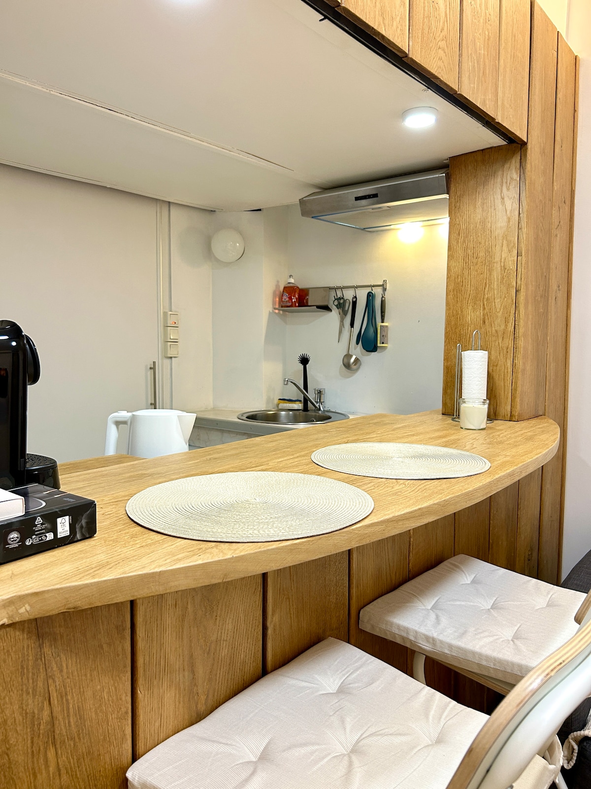 Renovated in the spirit of the 1950s food shops from the former Halles de Paris, with a joyful pop-70s twist, this spacious studio offers the perfect blend of modern comfort and vintage charm—far more than just a typical hotel room. The kitchen echoes classic formica style and includes every piece of equipment you could dream of (go ahead, quiz us—you’ll be surprised!).