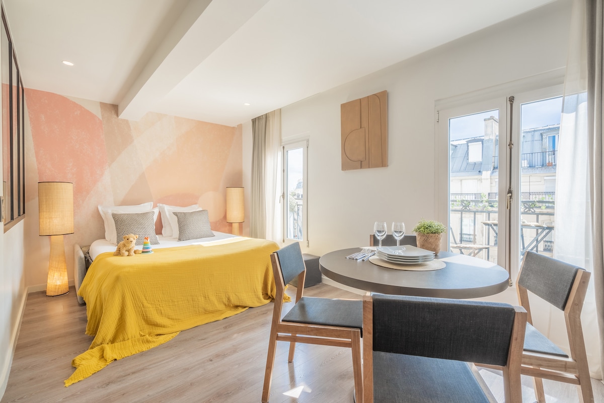 Renovated in the 1950s spirit of the old food markets of Les Halles in Paris, with a joyful pop touch of the '70s, this 2-room apartment offers the perfect blend of modern comfort and vintage charm. The kitchen, inspired by classic Formica style, includes all the equipment you could need; the living room, thoughtfully furnished with contemporary design references, ensures both relaxation and conviviality; and the dining area invites you to take a gourmet or studious break—or both!