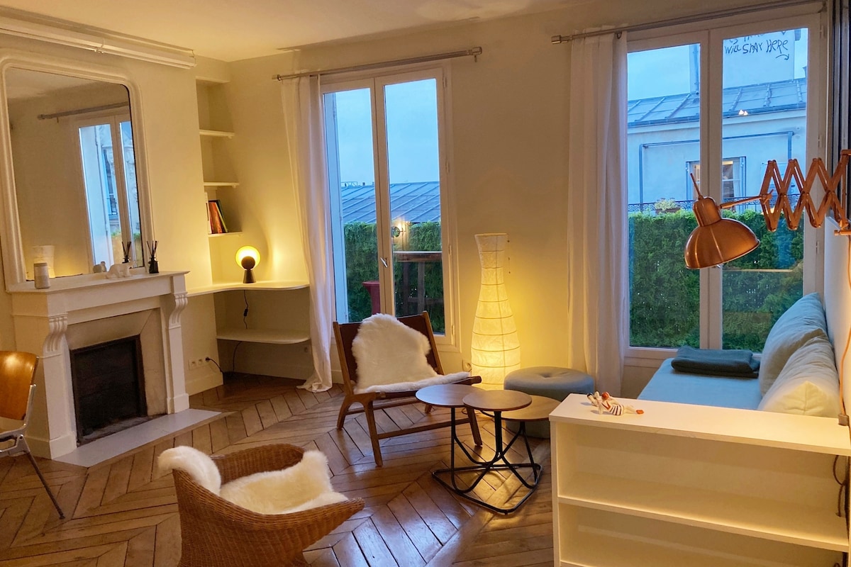 6 th floor with elevator, 2 bedrooms with double bed and a sofa in the living room (5 places), a fireplace and bathroom. Bright and near the Sacré Coeur and the Moulin Rouge my flat is calm, sweet and original, in the heart of an area full of bars and restaurants.