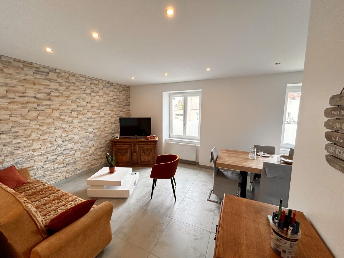 Charmant studio entièrement rénové, décoré et équipé, idéal pour un couple ou une personne seule. Le studio est composé d'une belle pièce à vivre avec cuisine, coin repas et coin salon équipé d'un canapé convertible haut de gamme pour que vous puissiez disposer d'un vrai canapé et d'un vrai lit, internet et abonnement Netflix inclus. Le centre historique 500 m à pied, la gare de Mulhouse à 15 minutes à pied, tram, bus, commerces à 300m et la proximité des axes routiers.