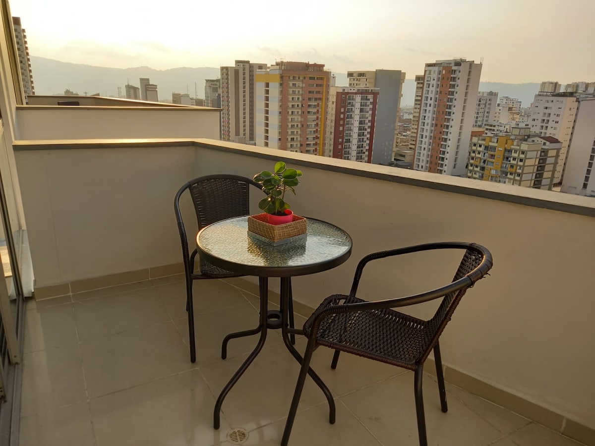 Espectacular apartamento en piso alto con excelente vista de la ciudad, completamente amoblado con todo para brindarle toda la comodidad a nuestros huéspedes, ubicación ideal y segura para moverse en Bucaramanga y el área metropolitana. Contamos con una cama matrimonial y un sofá cama. El edificio posee portería y vigilancia las 24 horas. -ENGLISH SPOKEN HERE-