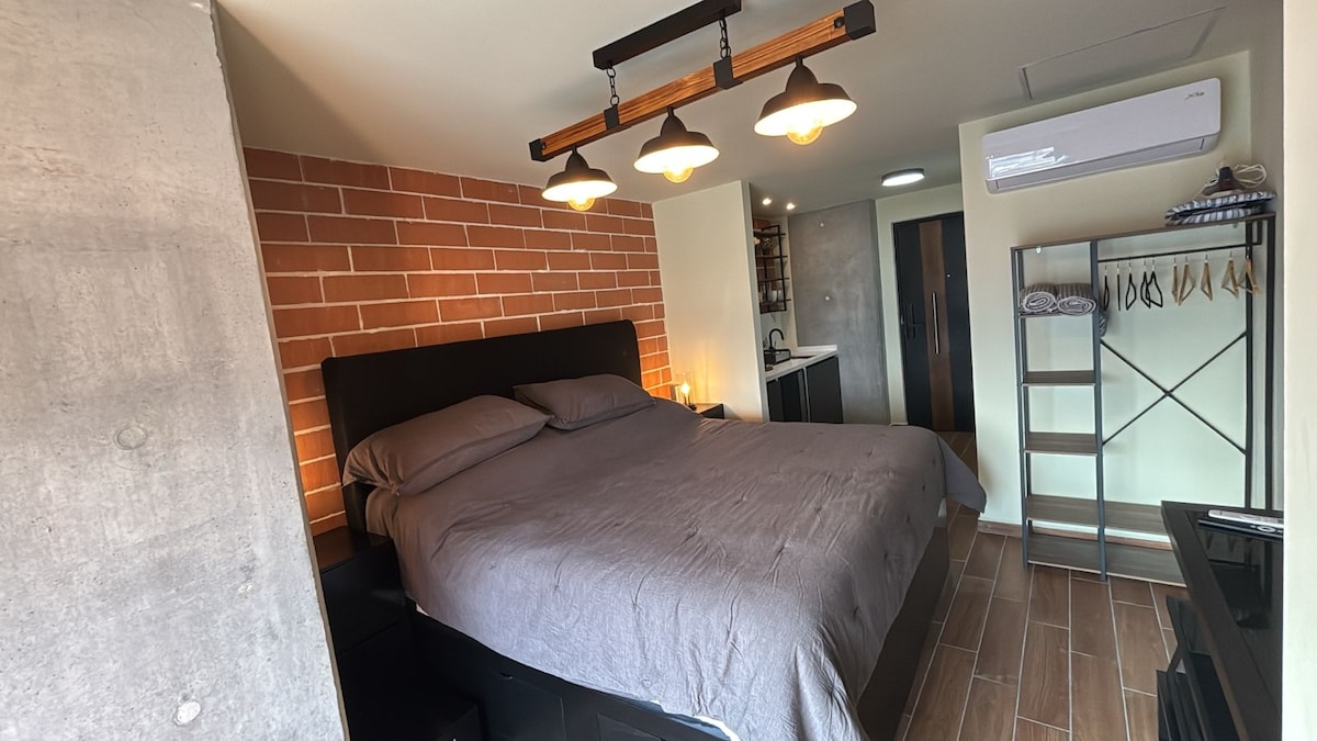 ¡Bienvenido a Barrio Vergel! Vive el centro de Monterrey en nuestro departamento con acabado excepcional y vista al horizonte de la ciudad. ¡Ubicación única! Wifi, Smart TV, climatizado, 1 cajón de estacionamiento. Ideal para ejecutivos y turistas. Seguridad 24/7, 3 elevadores. Puedes ir caminando a la Macro Plaza, aquí encontrarás acceso rápido a Cintermex y Arena Monterrey. 1 baño completo y 1 recámara con cama Queen.
