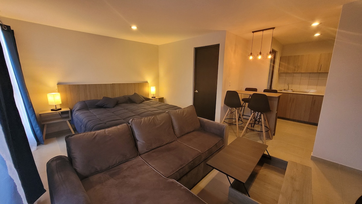 Hermoso loft minimalista con acabados de lujo, vista espectacular hacia la Estrella de Puebla Angelópolis. Cuenta con todos los servicios para estancias cortas, medianas y largas. Wifi, Smart TV, microondas, refrigerador, estacionamiento privado, amenidades como piscina, jacuzzi, spa, sauna, vapor, gym, fogata, jardín zen, crossfit, cancha de bascket,salón de yoga y pilates, coworking, sala de juntas, etc. El loft tiene capacidad para 4 huespedes, 1 cama matrimonial y 1 sofá cama.