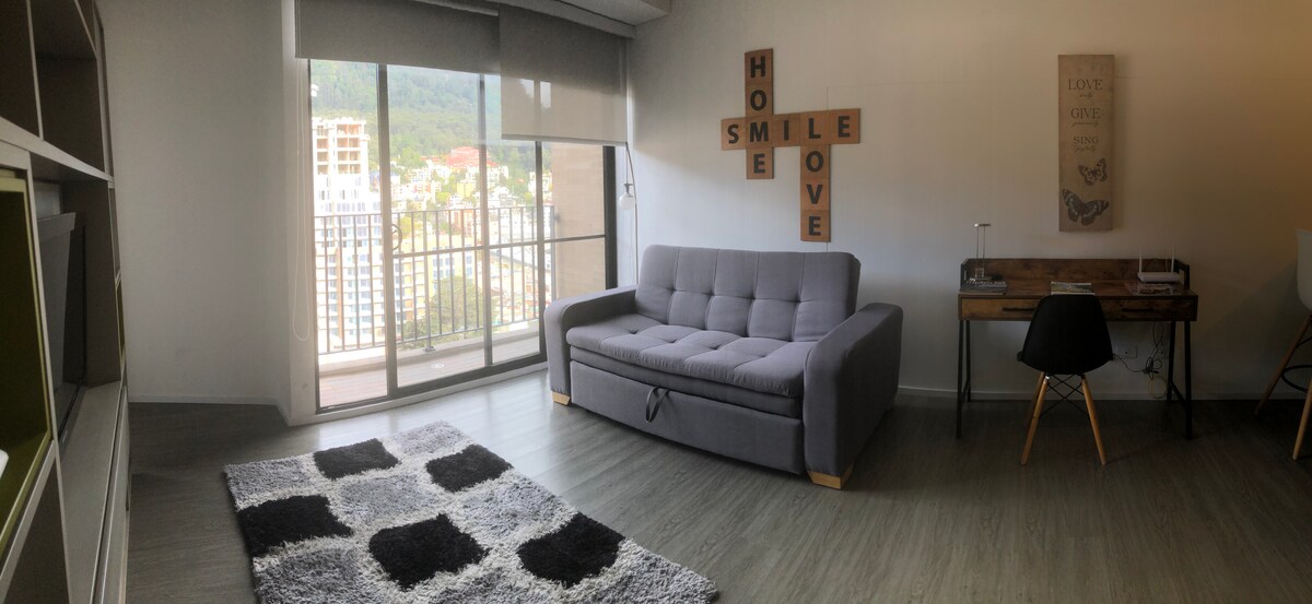 Recently renovated charming Studio. This place is strategically located: close to markets, museums, San Martin Mall, Monserrate, La Candelaria, La Plaza del Perseverancia, la Calle Bonita, National Park International Center (Financial zone), and countless restaurants, bars, and cultural activities that will make your visit to the city, an unforgettable experience. The building has a gym, coworking, pool area, and BBQ terrace on the top floor 360 View.