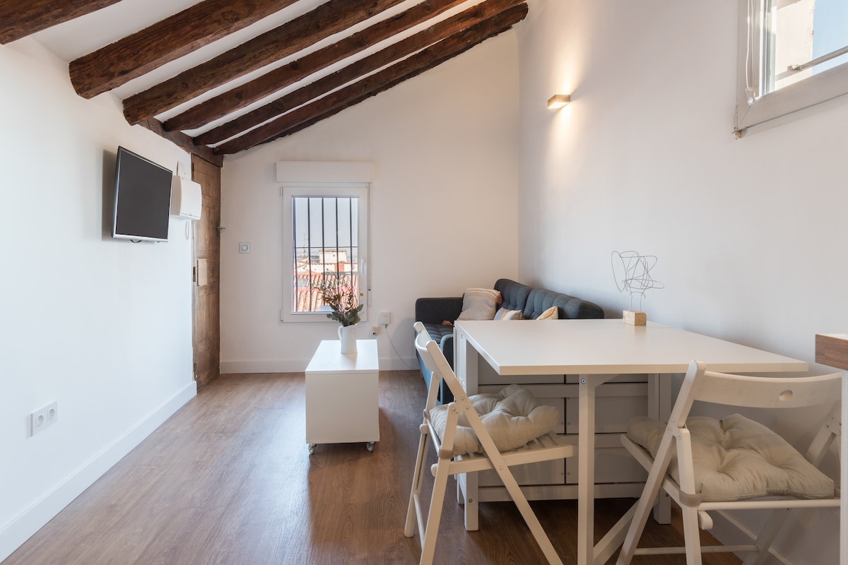 A very cozy apartment of 35 meters, with a unique style that has been able to merge the charm of the original building estructure, with a modern design. The wide brick walls make it a warm space in winter, and keep it cool during summer. Very well located, in an area with plenty of shops, restaurants, and cafes..., and very well situated to move to anywhere within the city, be it the historical centre, Ifema or the airport. A great option for a couple or family.