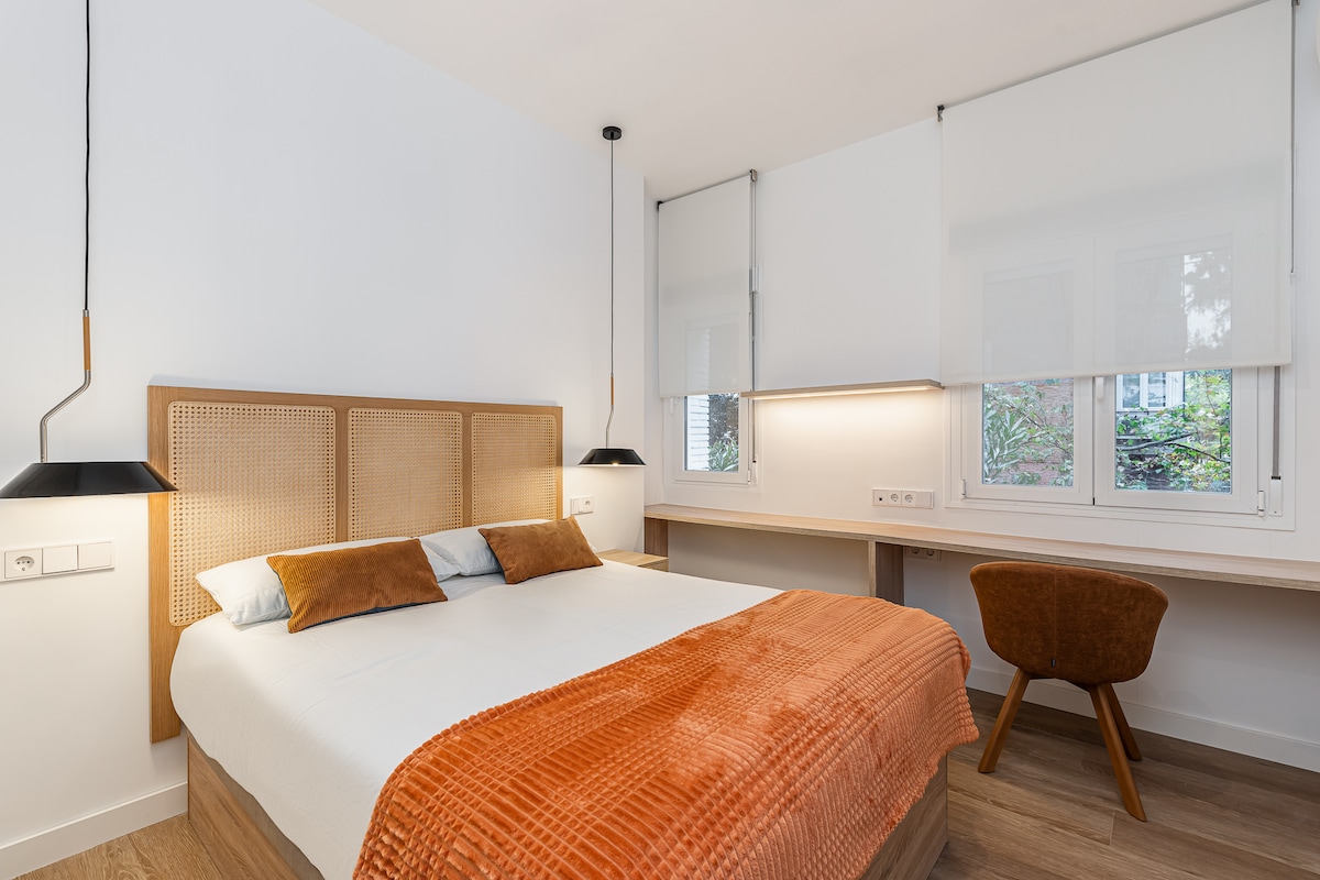 Alojamiento en Chamberí con habitaciones privadas y baño en suite. Disfruta también de una terraza común con comedor y salón exterior. Accommodation in Chamberí with private rooms and en-suite bathrooms. Enjoy a shared terrace with dining and lounge areas. Hébergement à Chamberí avec chambres privées et salle de bain attenante. Profitez aussi d’une terrasse commune avec coin repas et salon extérieur.