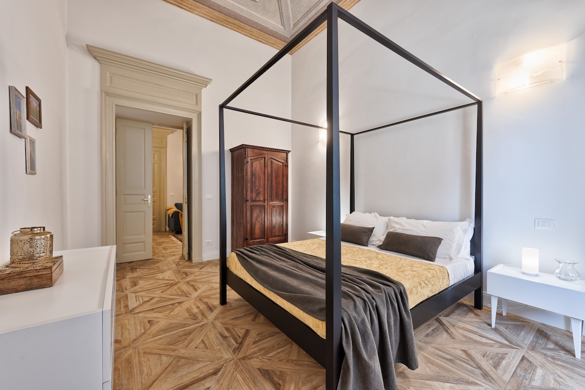 Located in one of the most beautiful streets of the historic center of Turin, rich in handicraft and traditional local shops, the apartment, within less than a minute walk from Piazza Castello, is located on the third floor of a building of 1700, with common areas recently and completely renovated. Quiet and comfortable, it is suitable for individual travelers or couples, and it is elegantly furnished with utmost attention to detail.