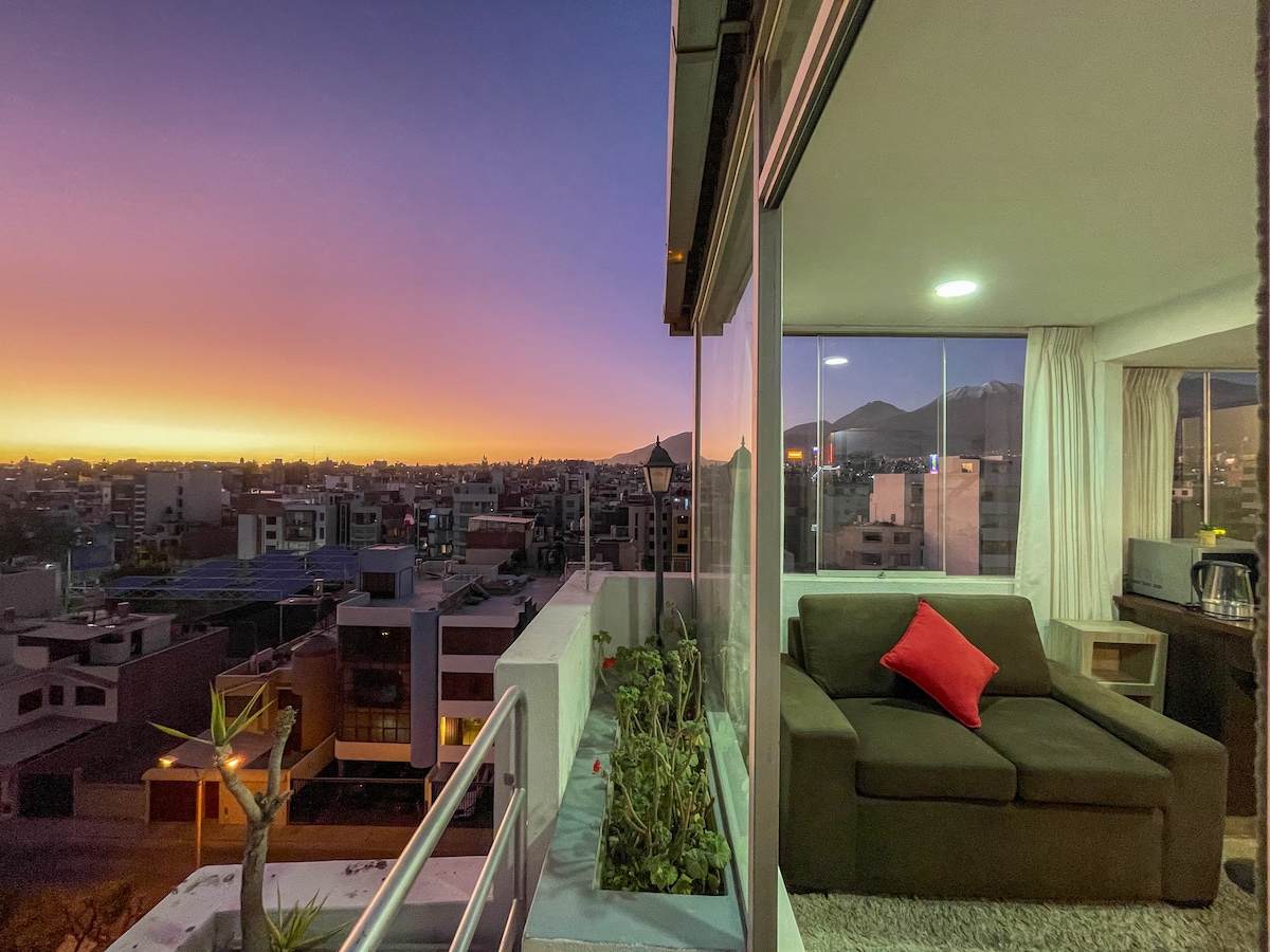 Relax in this quiet and elegant space. You will have the best Arequipa sunset from a charming balcony, in the most exclusive area of Cayma district. We invite you to visit this cozy mini apartment located in a private condominium with elevator, three blocks from the Plaza of Cayma and the best shopping centers, malls, banks and restaurants in the city.