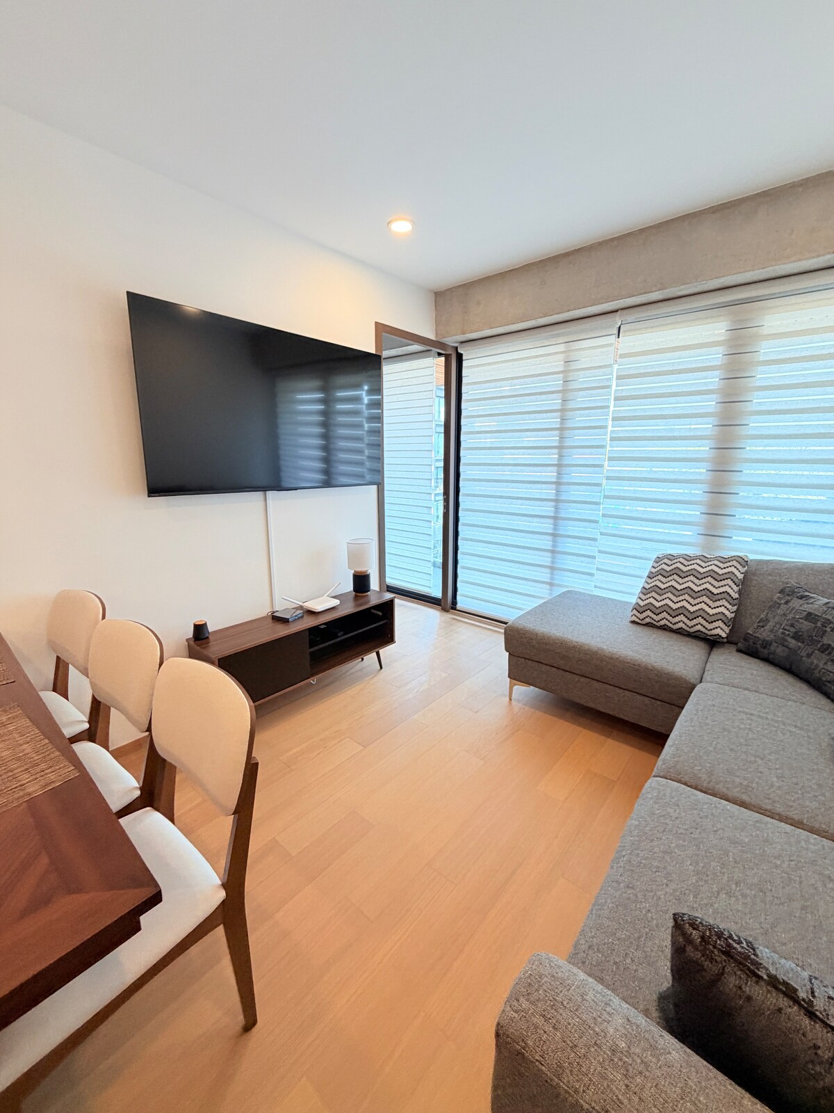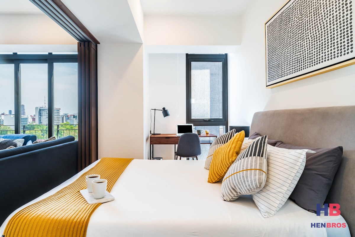 Modern Minimalist Apartment in the Heart of Polanco Stylish Living & Breathtaking City Views Enjoy a comfortable and homely experience in this spacious, bright, and fully equipped one-bedroom apartment in the vibrant Polanco district. The modern minimalist décor and breathtaking city views create a relaxing urban oasis. Located on the 21st floor with easy elevator access, you'll have stunning views from both the living room balcony and bedroom windows.