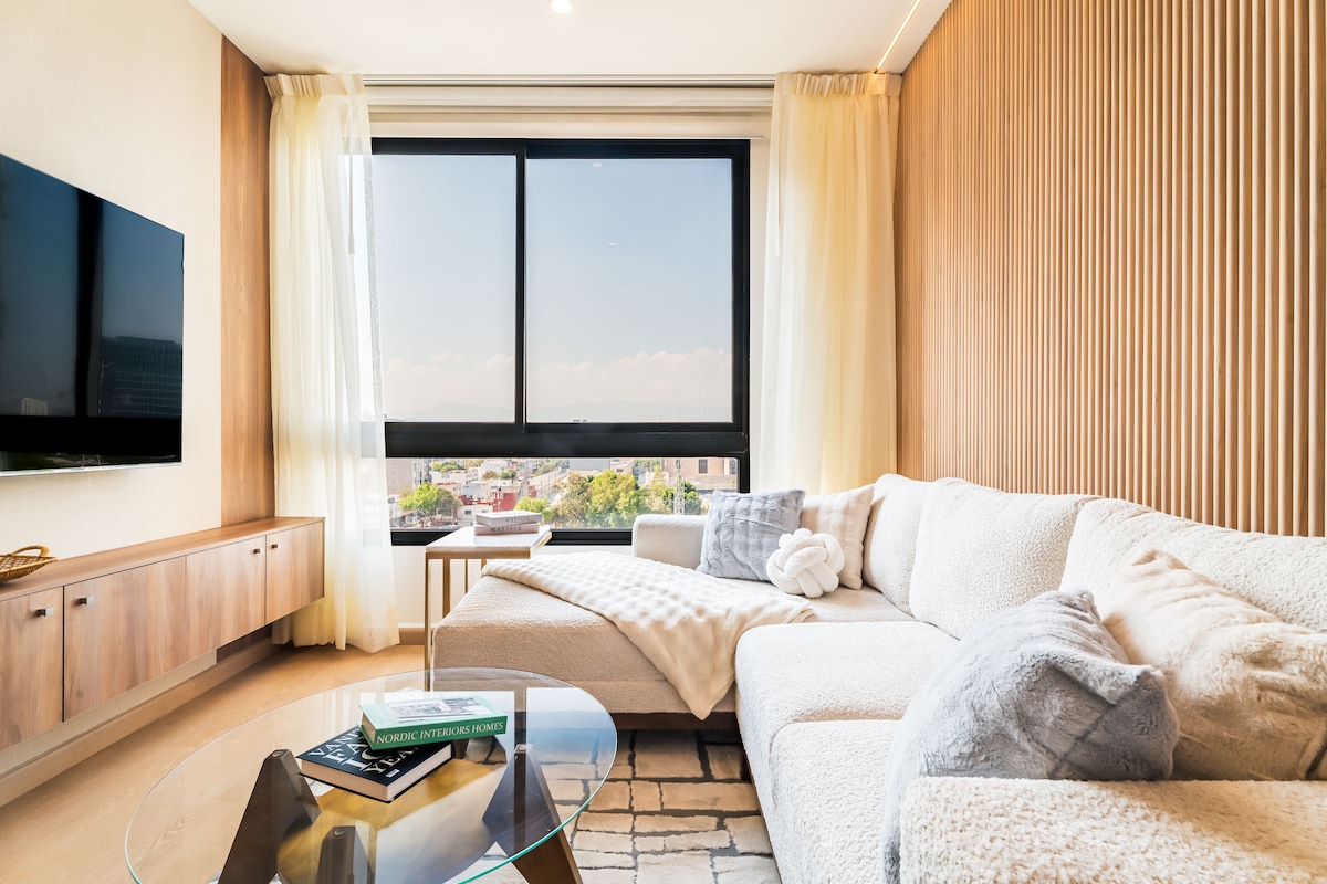 Ideal for home-office, great balcony and high-speed wifi 60Mbps ↧ 5.90 ↥ Enjoy the view of the volcanoes on a clear morning from the balcony of this bright apartment. The unit is specially designed to make your visit the most comfortable, surrounded by modern art and unique details. The building has high security 24/7 and incredible amenities: a swimming channel, well-equipped gym, pool table, ping pong tables, sauna, Jacuzzi, and exterior terrace for you to relax and enjoy sunny Mexico City