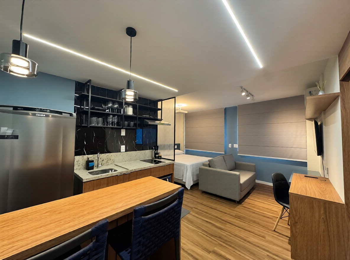 Viva o Centro do Rio neste apartamento onde LED embutida no teto e parede azul petróleo criam ambiente sofisticado. Piscina e academia 24h no prédio completam experiência premium em localização estratégica. Espaço moderno para 3 pessoas com cama queen, sofá-cama, mesa grande para trabalho e refeições, bancada de mármore e ar-condicionado. Blackout garante descanso total. Centro estratégico: Cinelândia, Lapa e Santa Teresa próximos. Ideal para business e turismo cultural. Portaria 24h.
