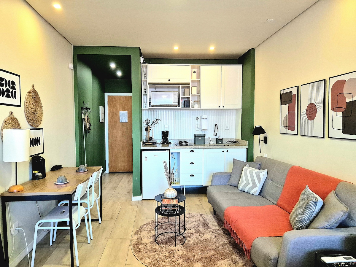 "Apartamento novo p/ solteiro(a) e/ou casal, bem iluminado, climatizado c/ Split, geladeira, cooktop 2 bocas, coifa, torneira gourmet c/ filtro, micro-ondas, cafeteira, TV LED 32", mobiliado com guarda-roupa de 3 portas, cama casal de 188 cm de altura x 138 cm de largura., mesa c/ 2 cadeiras, mesa p/ LapTop e bar c/ taças p/vinho. Condomínio c/ portaria 24h, próximo de diversos pontos turísticos da Lapa, além de supermercados, salões de beleza, farmácias, bancos, hospitais, restaurantes, etc."