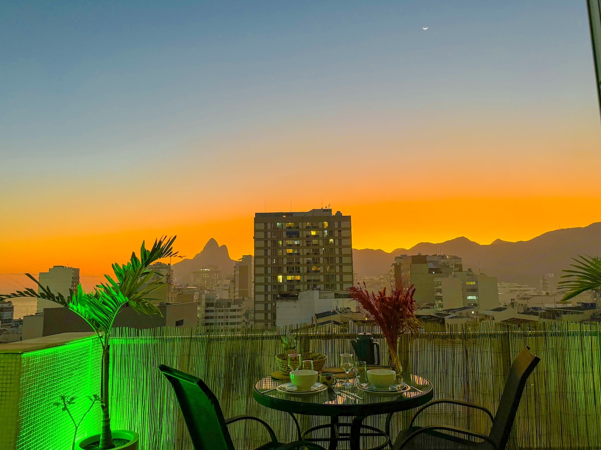 Attention lisez attentivement : Não fazemos desconto, por favor NÃO INSISTA Duplex studio neuf et désigné par un architecte : un seul lit double avec draps de qualité, un sofa convertible ( 1 place) et une Cuisine amenagée. Terrasse avec table et chaises. Immeuble de luxe avec salon et salle à manger collective, terrasse de Home Office avec wifi, laverie avec 4 machines à laver/sécher et Roof Top avec piscine collective et vue sur le Christ Redentor