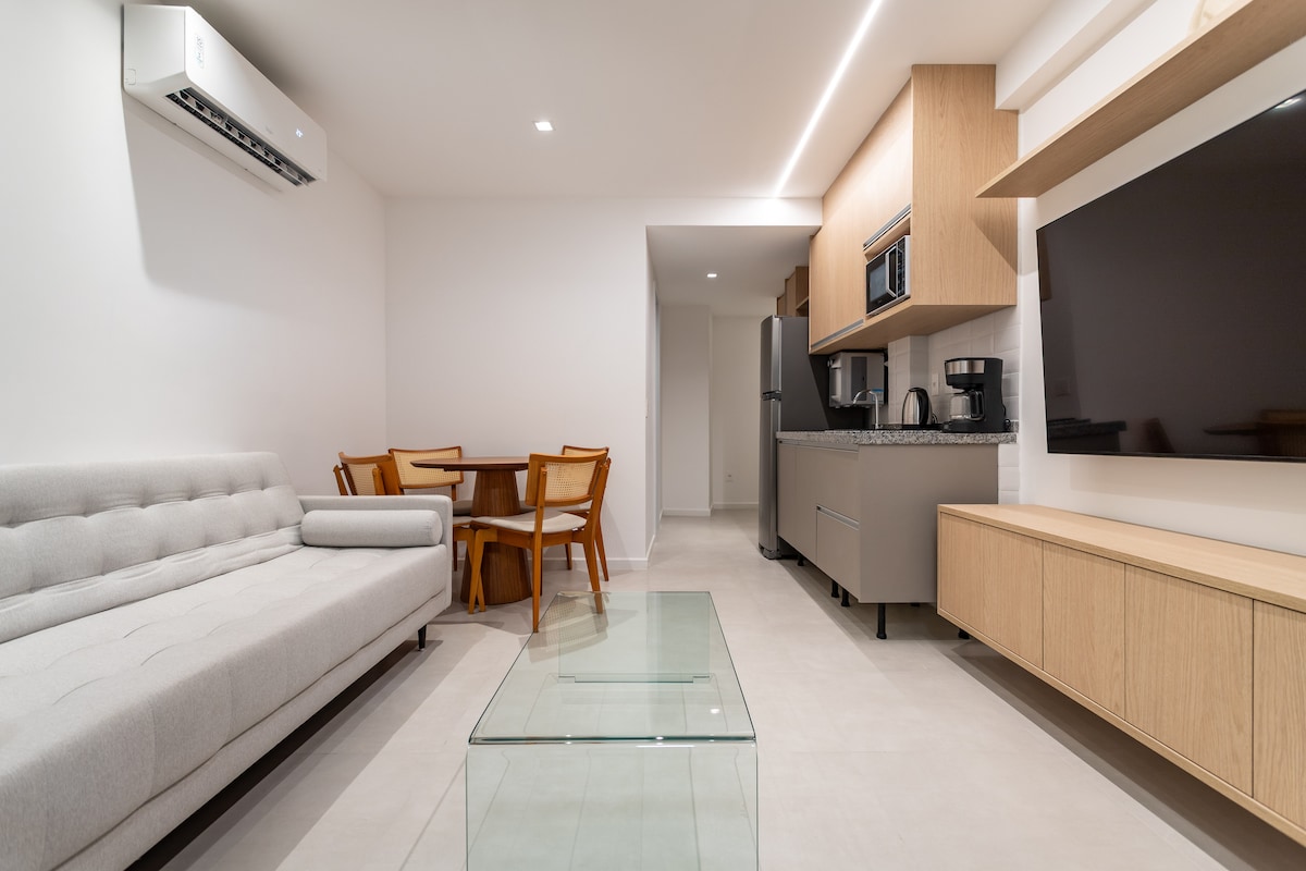 Apto, estilo loft, moderníssimo e acolhedor. Possui quarto independentes com cama de casal. Sofá-cama na sala, banheiro espaçoso, lavabo independente. Tudo bem planejado e decorado. A área gourmet é integrada à sala (cozinha americana), ótima para interação entre os hóspedes. Cozinha com fogão elétrico de 2 bocas, frigobar, micro-ondas, forno elétrico e cafeteira etc. Toalhas e roupas de cama para os hóspedes. A menos de 10 minutos, até o metrô ou Aterro do Flamengo e demais pontos culturais.