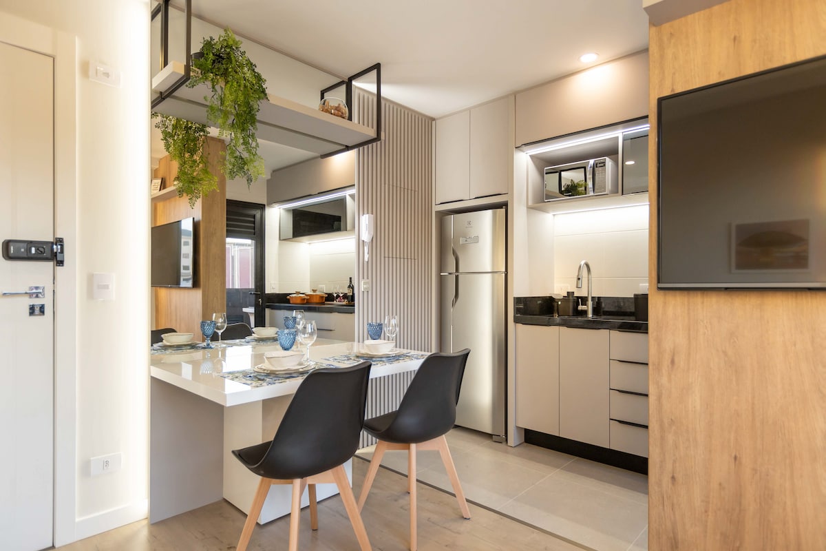 Studio moderno, novíssimo, aconchegante, perfeita localização, com uma linda vista da sacada, principalmente a noite . Wi-Fi rápido, mesa de trabalho, TV smart 55” , cama Queen. Ar condicionado (quente/frio). Máquina de lavar e secar roupa e uma linda ilha na cozinha. 50m2 de muito estilo-27ºandar, Silencioso. No Centro/Batel, próximo à comércios, bancos, shoppings, polo gastronômico e Hospital . No prédio :Piscina, academia, sala de jogos, sauna, jacuzzi, portaria 24 horas.