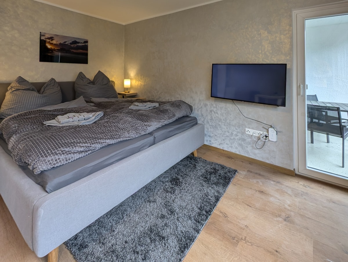 Welcome to this stylish, centrally located, and fully furnished apartment. For a wonderful and hassle-free stay, we offer: ->Flexible keyless check-in ->Fully equipped kitchen ->Two 160cm x 200cm hotel box spring beds ->Beds can be separated and made into single beds as needed ->Less than 5 minutes by car to the exhibition center ->3 minutes by car to the university hospital ->Close to the city center ->Smart TV with Netflix ->Professionally cleaned after every stay