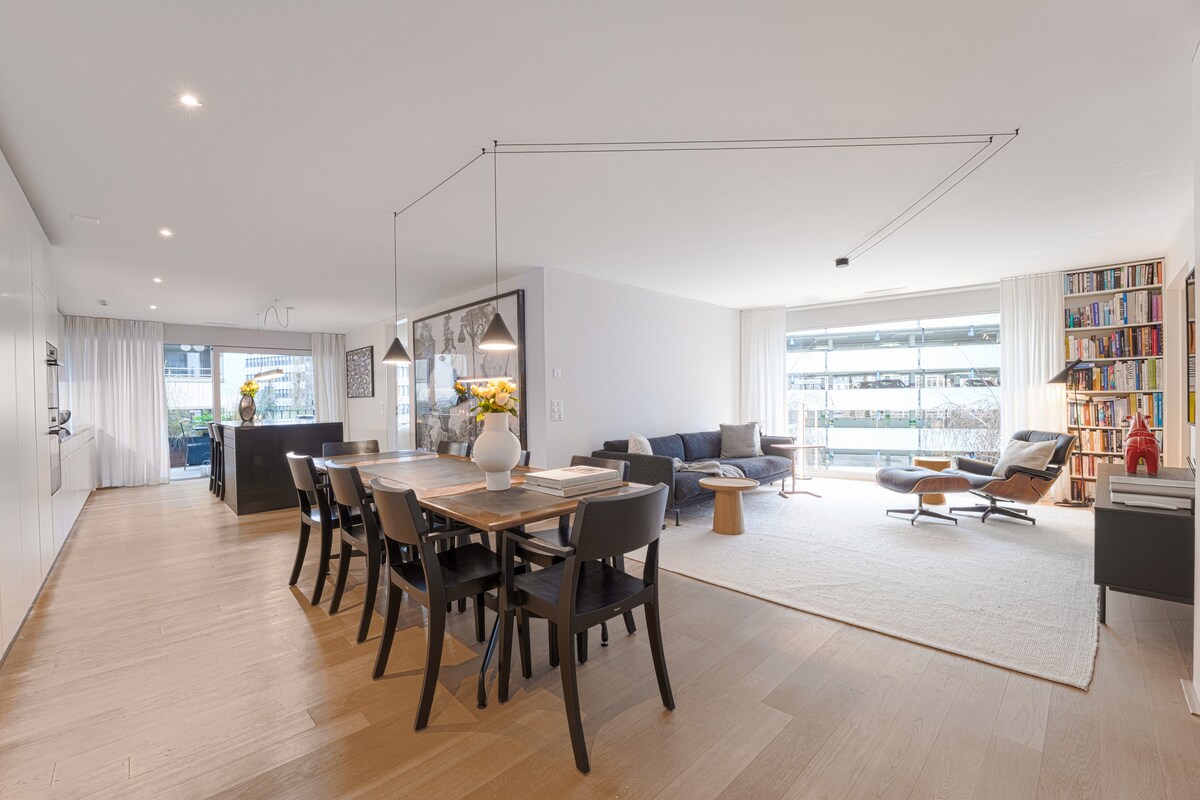 Entire apartment - 81m2 step-free, bright, spacious & modern (built 2015, to Swiss eco-friendly MINERGIE standard) (30m2 room at hotel opposite can cost 450CHF/night) SONOS speakers, dimmable smart wifi lights & very fast fibre internet! 2 min train ride to main station, 9 min train to airport & 11 min train to Lake Zurich (Tiefenbrunnen). 3 min to supermarkets, gyms, bars & clubs Luxury wood parquet. Quality Miele appliances, inc. own washing machine & drier (which is unusual in Zurich)!