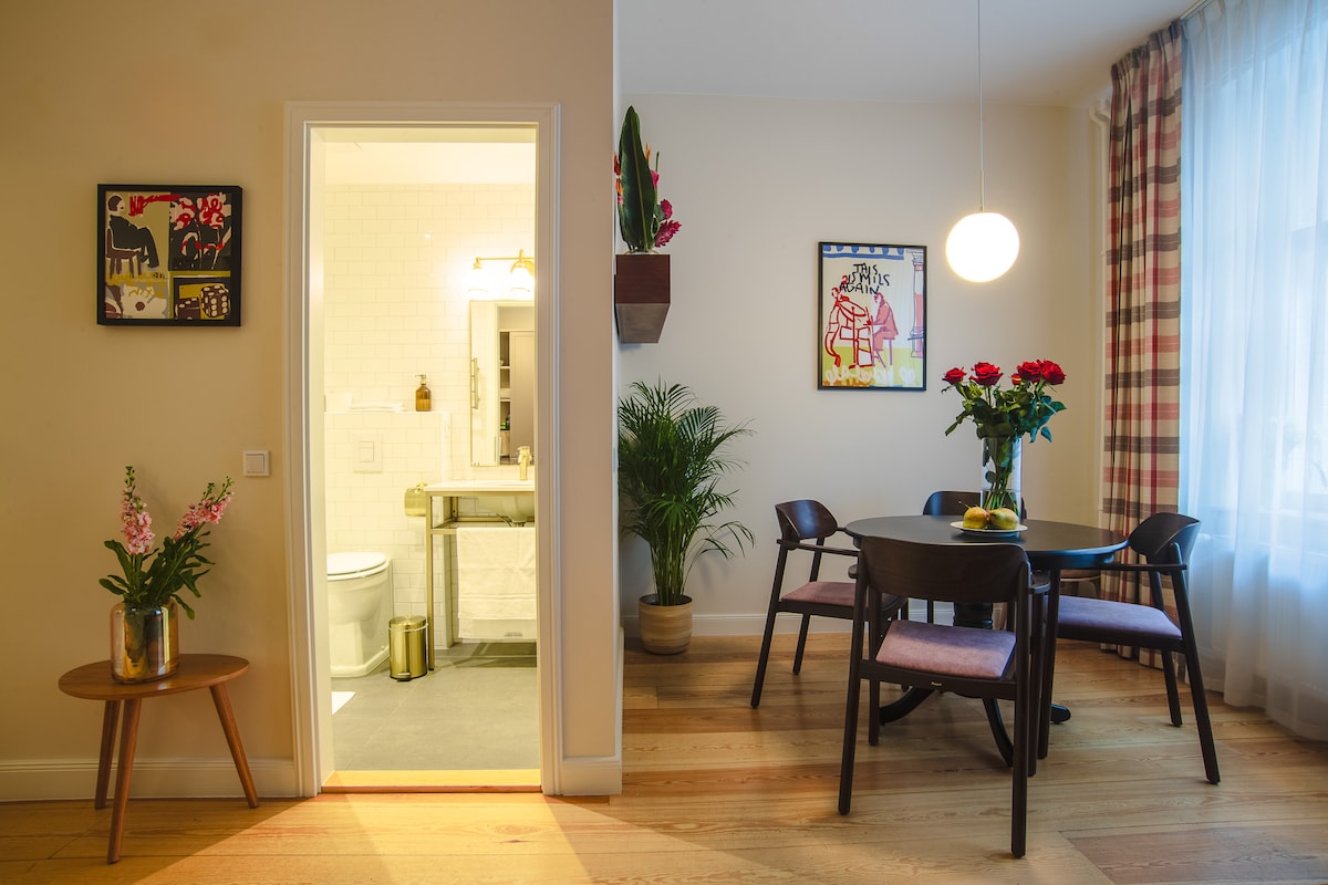 Welcome to this spacious and elegant private suite in the historic heart of Berlin, just a short walk from the city’s most important landmarks, excellent restaurants, and vibrant shopping areas. Enjoy complete privacy, peaceful garden views, quiet sleep, and refined modern comfort. Floor to ceiling windows fill the space with natural light, while a luxurious king size bedroom, a high-end kitchen, and a sleek bathroom with a rain shower and bathtub create a calm retreat in the middle of the city.