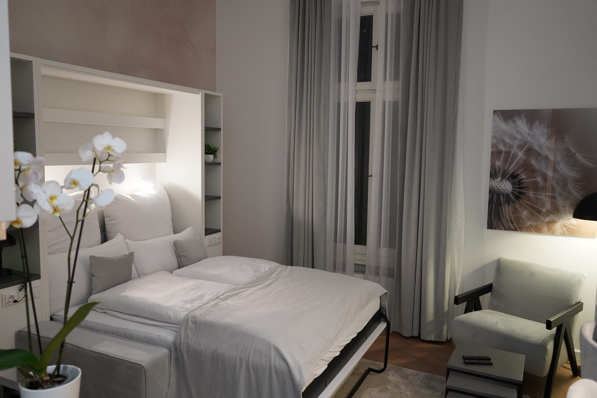 Lovely little studio (35 m2) in the BEST city location, on foot to Alexanderplatz. Ideal for a SHORT stay of 2 persons. Good for business travelers! PROS: balcony for smokers (!) + a lot of daylight + stable WiFi + hairdryer + basic cooking facilities + high quality queen size bed + check-in at night possible + plenty of public transport options + elevator + babybed (if needed) CONTRAS: no parking facilities in the area - no washing machine - no a/c (hot in summer) - no TV - expensive