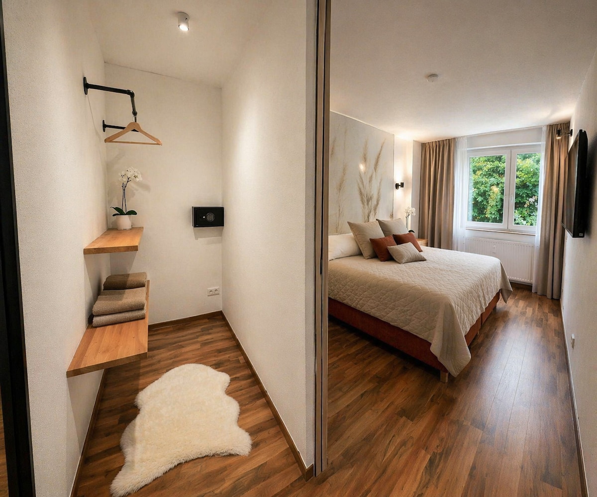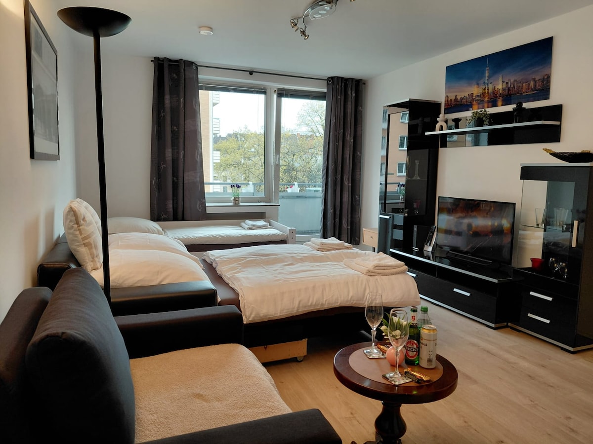Das Appartement ist zentral in Düsseldorf -Friedrichstadt gelegen. Das Appartement besteht aus einem Ess- und Wohnbereich mit Schlafsofa (mit durchgehender Matratze) sowie einem Schlafzimmer. -Smart-TV und Balkon. Im separaten Schlafzimmer befindet sich ein großes Doppelbett und ein geräumiger Kleiderschrank. Dort ist auch ein heller, großer Schreibtisch vorhanden. Dort kann auch die 3. Person auf dem Extrabett schlafen. Die Betten sind bereits bezogen und Handtücher liegen bereit.