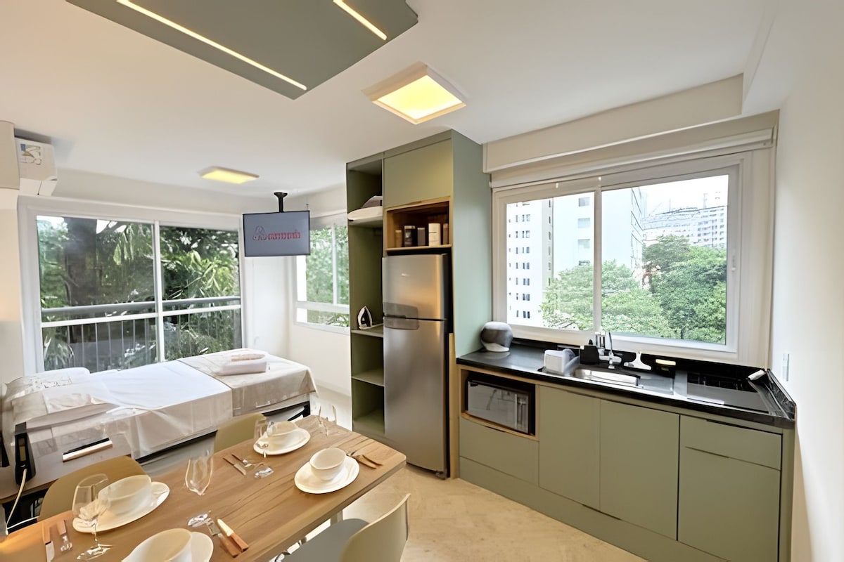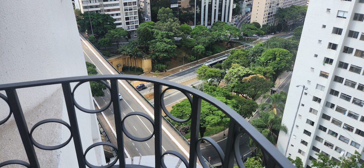 Wonderful view!!!...FREE SPACE Newly renovated 40m2 apartment on a high floor, with balcony and incredible views. 4K TV with more than 300 channels. 500 mega WIFI speed Full kitchen. Bedroom with double bed and sofa bed in the living room for one person, dining and work room. Privileged location, we are 50 meters from the MASP/TRIANON station and Av. Paulista. 100m from Sirio Libanes and 9 de Julho hospitals. 5 minutes from Fund Getulio Vargas and Shopping Cidade S.Paulo.