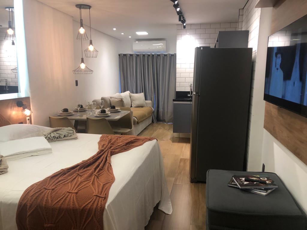 Apartamento (URL HIDDEN) espaço para estudo e trabalho. O espaço apesar de ser pequeno é muito aconchegante com (URL HIDDEN) cozinha (fogão, pia e mesa), banheiro, sala de estudo (escrivaninha, cadeira e poltrona) e quarto (cama, televisão). Ou seja, tem tudo o que é necessário para uma estadia de pouca duração.