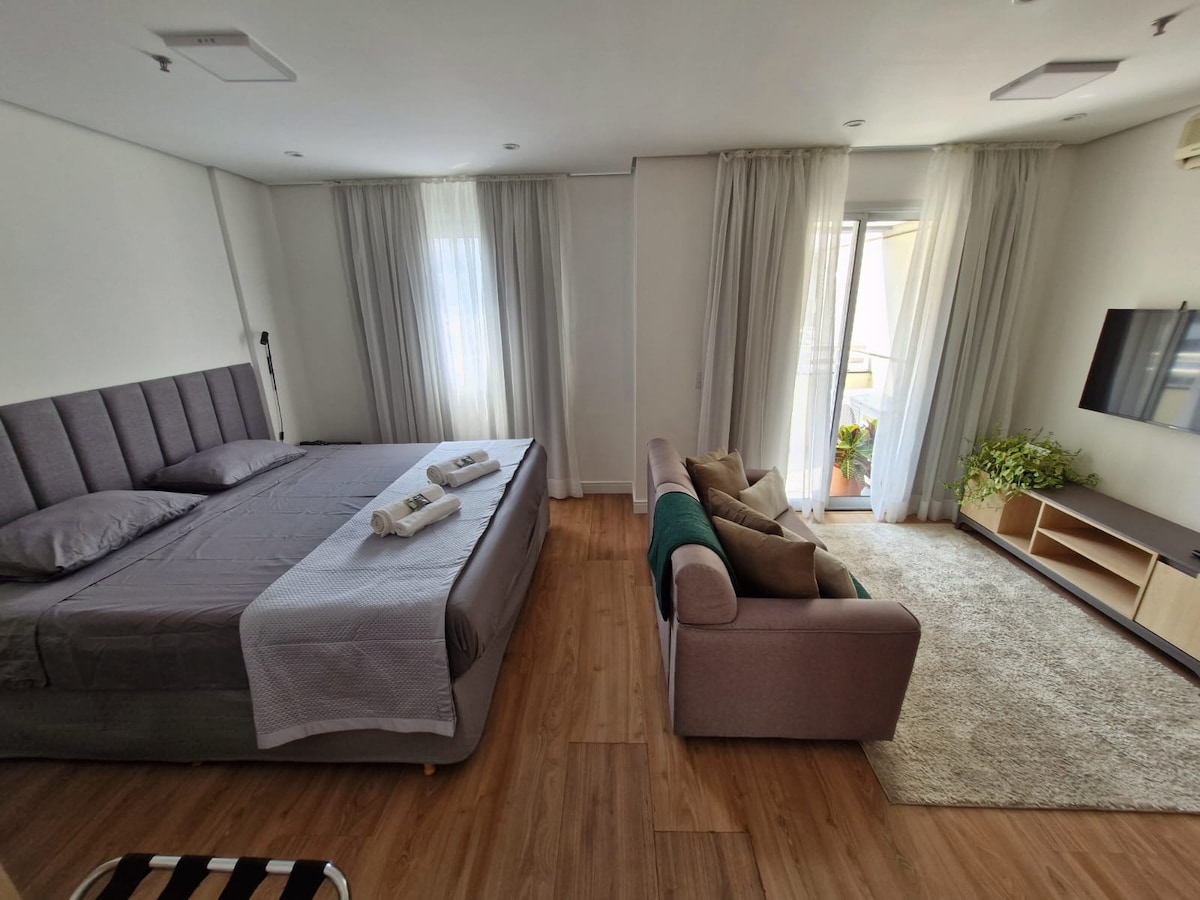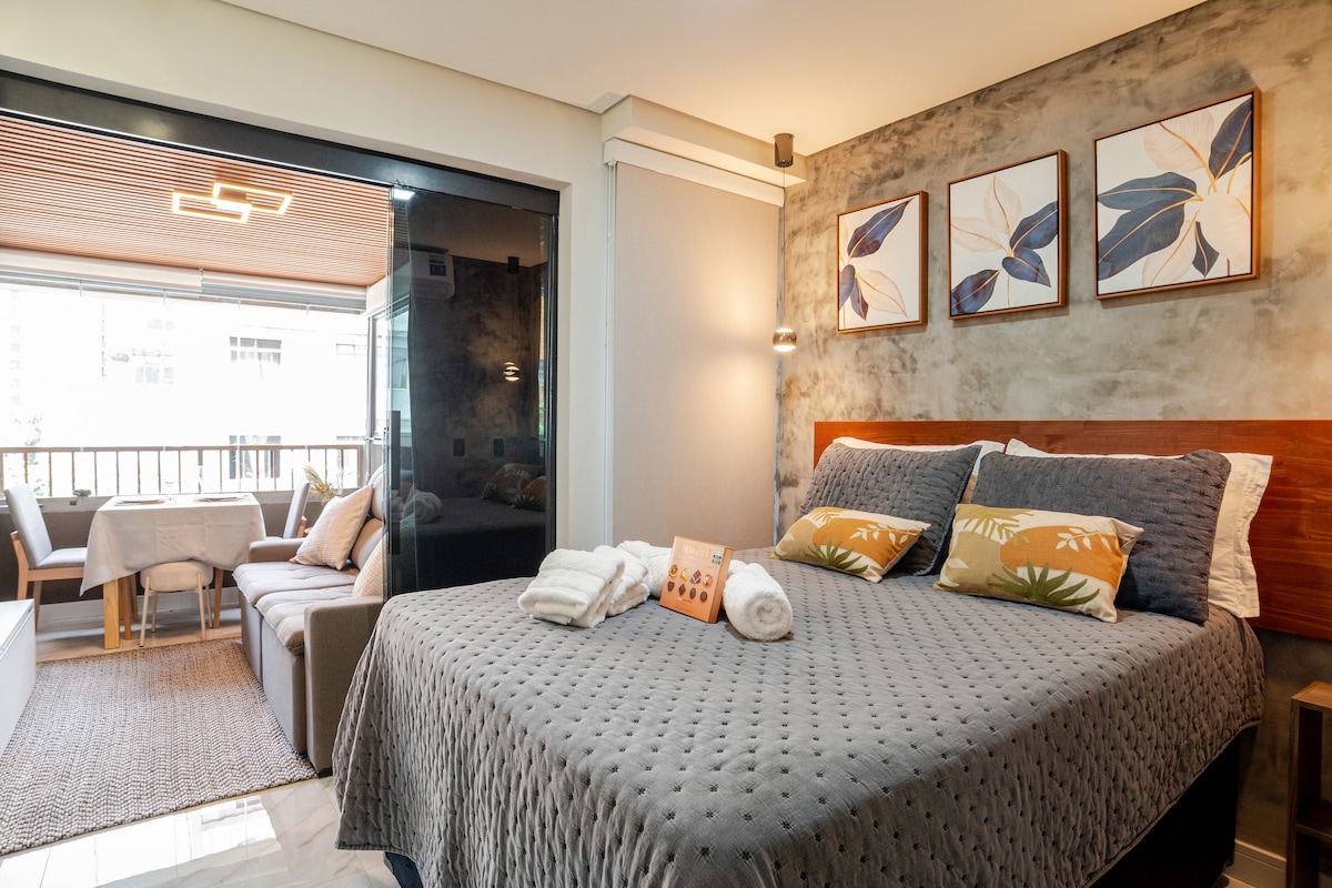 A unique space. Have a true Paulistana experience! Flat with 44m2, 1 bedroom with double bed (noise-resistant window), living room with 65p TV, Wifi, kitchen, new and renovated apartment, balcony, free parking, close to several shopping centers, convenience stores, fantastic restaurantes, in the coolest and most famous neighborhood of São Paulo, close to Subway (400 meters) , beautiful view of Av Paulista. Accommodates up to 3 people (1p in the living room sofa-bed). 24h reception desk.