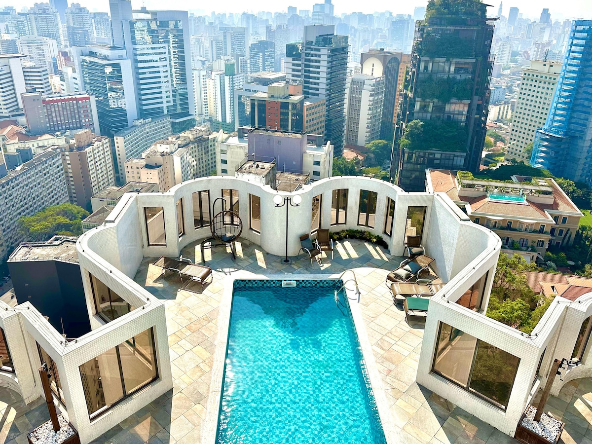 Apartamento completo com ar-condicionado no quarto, TV, cozinha compacta e varanda com vista incrível de São Paulo. Wi-Fi gratuito e limpeza diária. Prédio com recepção 24h, piscina, sauna, academia e jacuzzi coletiva. Estacionamento e café da manhã pagos à parte, servidos no restaurante do térreo. A uma quadra da Paulista, atrás do MASP, perto de tudo!