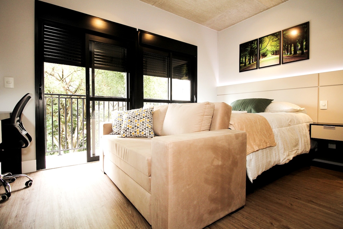 CStudio novíssimo, moderno e aconchegante para chamar de Seu! Hospede-se no melhor de São Paulo: no Jardins, a 1 quadra da Paulista, próximo dos pontos mais incríveis de Sampa, seja com viés cultural, compras, gastronómico... Muito bem equipado (incluindo micro-ondas, internet, cozinha completa, ar condicionado), é ideal para quem procura conforto e praticidade. Condomínio bem equipado, com academia e piscina. Localizado na Pamplona, a 200 m do Metrô Trianon, prox. ao Masp. O espaço