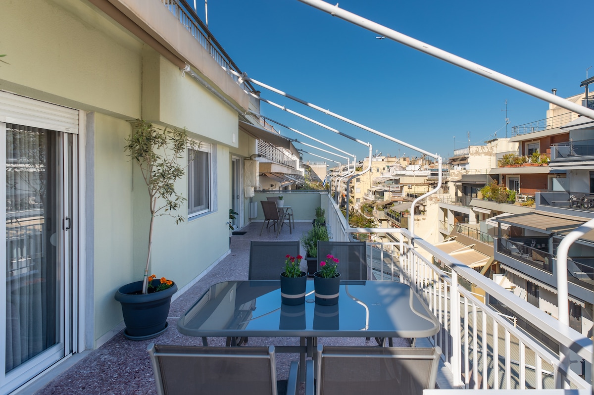 Unique 1 Bedroom fully equipped apartment on the seventh floor of a 2020 renovated building with a breathtaking terrace balcony. High speed internet, premium amenities, a luxurious queen size bed, and your very own Netflix account are but a few things we offer you. Luminous, spacious, with everything you might require to enjoy your stay in the heart of Thessaloniki's social life, only 5 minutes away from Aristotelous square and 2 minutes from the seafront. Welcome and enjoy your stay!