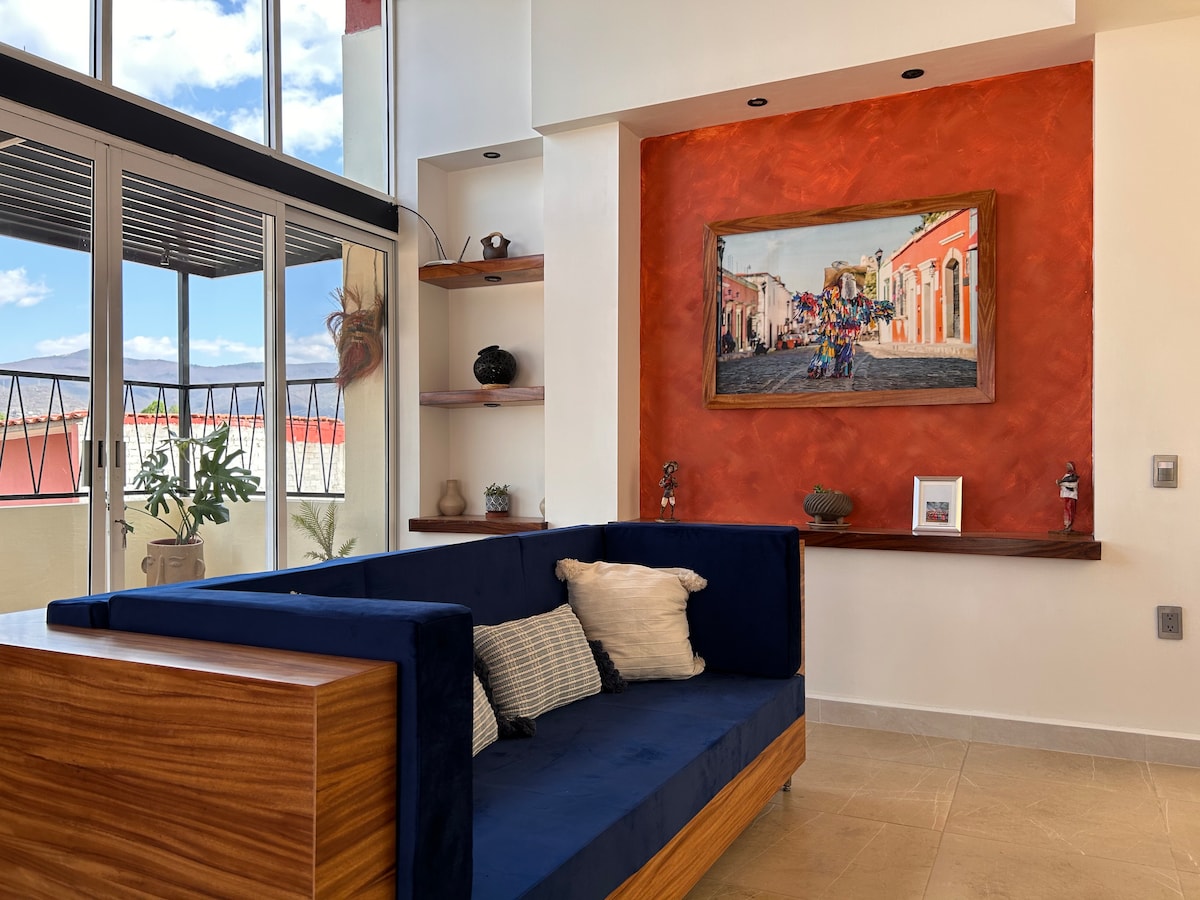 Espacioso y cómodo departamento-loft con diseño oaxaqueño contemporáneo. El apartamento está ubicado a sólo 3 cuadras de la plaza principal llamada Zócalo y 3 cuadras del templo de Santo Domingo de Guzman. A pasos de famosos restaurant multi premiados, galerías de arte, cafés y el bello andador turístico de la ciudad. Desde aquí podrás llegar andando fácilmente a todos los atractivos turísticos que la ciudad te ofrece.