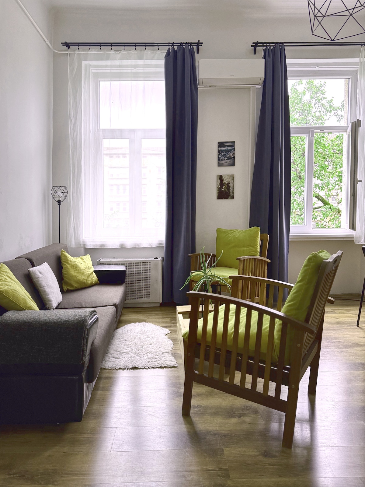 The stylish one bed huge 75sqm apartment has been fully renovated with stylish design in a mid-century beautiful house. The apartment is on the 3rd floor with an elevator in a very quiet area in the building. Located in one of the most fashionable areas of Budapest with city’s best bars, pubs, restaurants, museums, galleries, designer clothing boutiques, shops and historical architecture at your doorstep. The apartment has one bedroom, a living area, fully equipped kitchen and one bathroom.