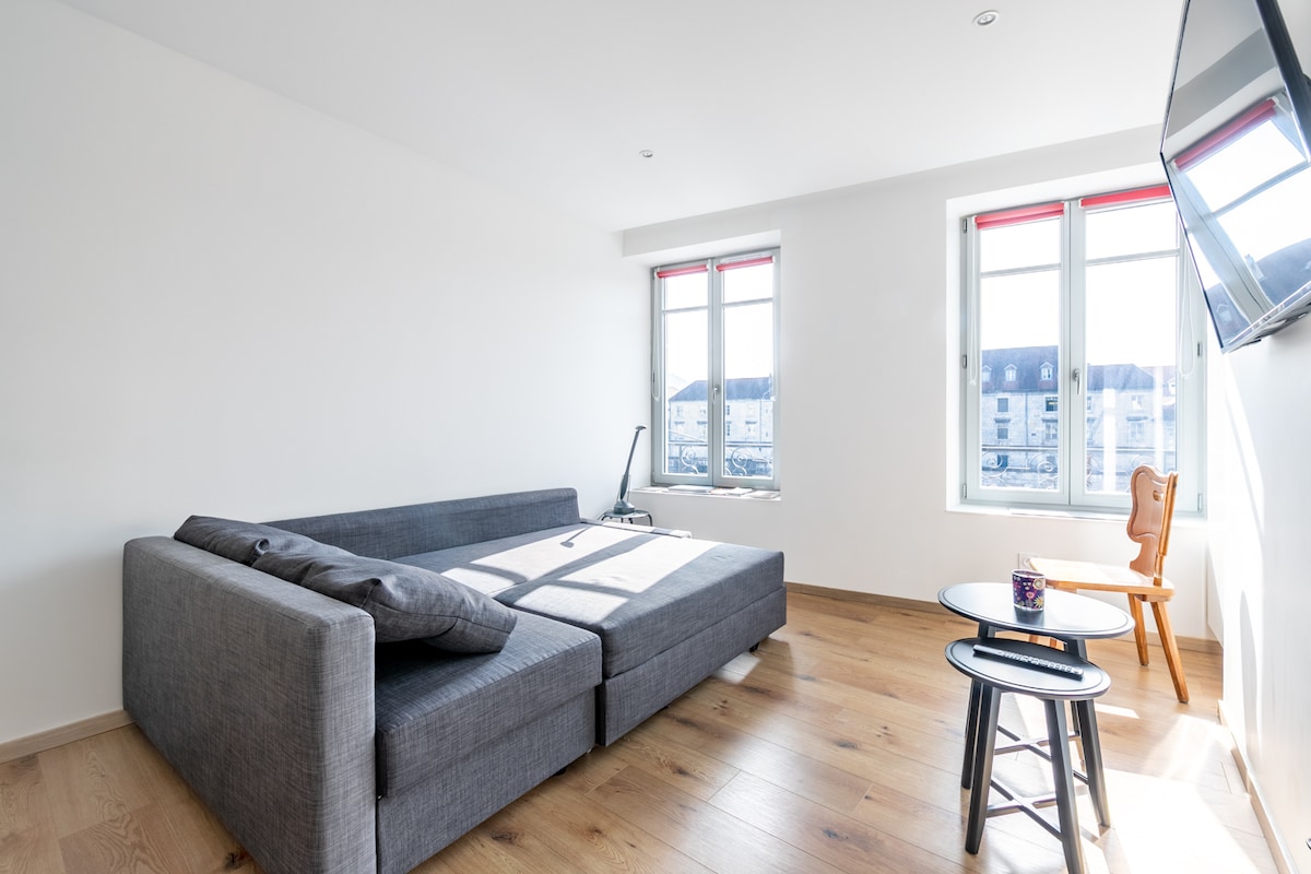 Cet appartement de 40 m2, très agréable et lumineux est situé au 3e étage d'un immeuble du XVIIIe siècle à Battant, quartier historique et animé de la ville. Il se trouve à 7min à pied de la gare Viotte et bénéficie d'un parking gratuit à proximité. Traversant, la pièce à vivre donne sur une jolie place ornée d'une fontaine et la cuisine sur une cour intérieure. La pièce à vivre comporte un coin nuit (lit double avec literie neuve) et un coin salon.