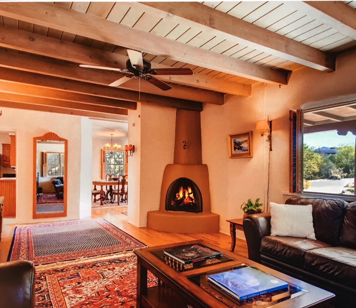 Set above the Santa Fe river, with views of Sun and Atalaya mountains, hiking trails accessible from the front door, and the shops, galleries & restaurants of Canyon Rd. just a short stroll away, "Sage Haven" emphasizes timeless simplicity & stillness. Built in 2020, the house has new strong wifi, smart televisions with AppleTV, Bosch appliances for the kitchen and laundry, a wood burning fireplace, terraces, luxurious baths, & deeply comfortable sleeping.