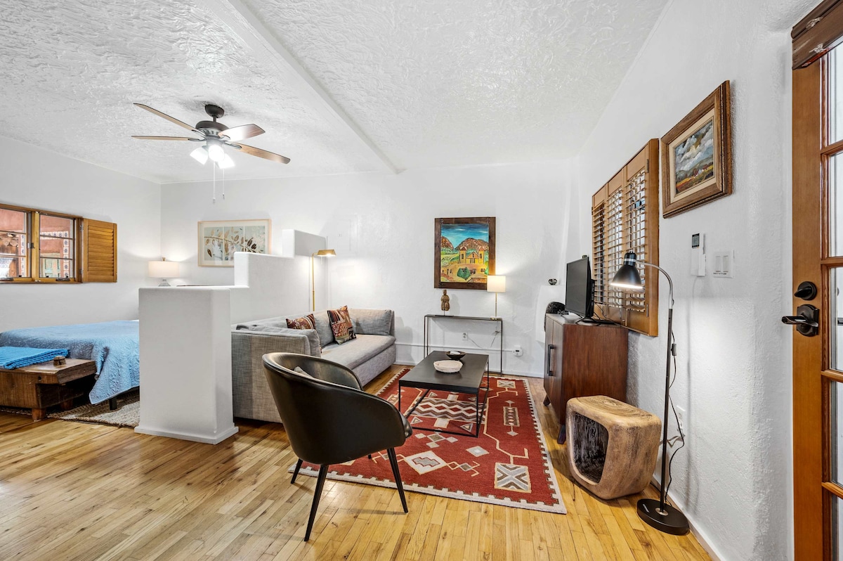 Small, but cozy and sunny Studio with sleeping loft (full size futon perfect for one person) is located in the heart of the old part of Santa Fe on a quiet street within walking distance to the Plaza. The decor is eclectic in the sense of "Santa Fe Style" popular locally with some distressed pieces of furniture. There is a kitchenette with 2 electric stove tops (no Microwave) convenient for quick heating up. There is a sturdy wooden ladder leading to the sleeping loft - beware if acrophobic.