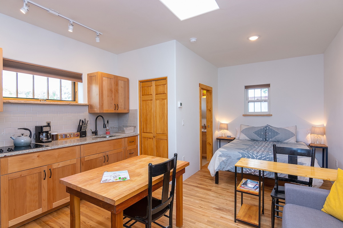 This newly built studio apartment (Winner of 2019 Historic Preservation Award) is a centrally located accommodation for guests who love to walk or for those who want to have a more urban experience in Santa Fe. We are equidistant to the Railyard District, Canyon Road, and the Downtown Historic Plaza. It is about a 15 minute walk to each from the apartment. Due to its location, this unit does get a fair amount of street noise and also, there is no oven, only a small toaster oven for countertop.
