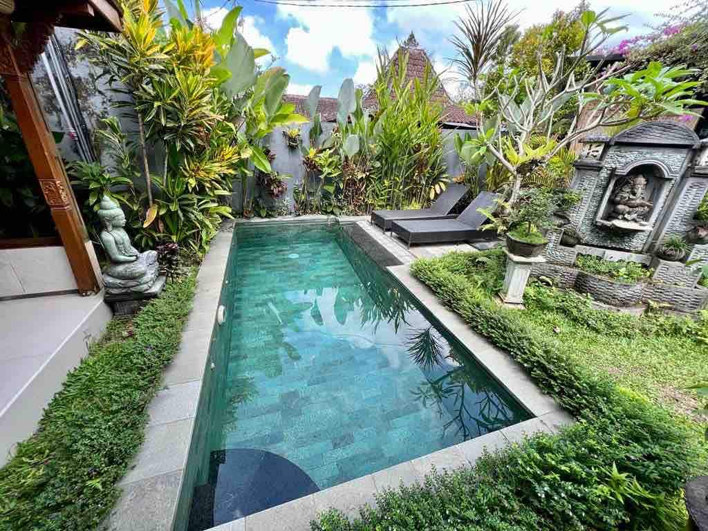 Luxurious private villa with 6x3 meter pool. Secure, private, safe. Lush garden and sheltered but open air kitchen for dining and relaxing by the pool. Queen bed, outside tub and shower, with fish pond view, fully equipped kitchen. AC, TV, great WiFi, daily cleaning and set breakfast is included. We are an 8 minute walk from the main road, or a short scooter ride. This means peace and quiet, and no car noise. Our staff will be happy to drive you in by scooter if needs be.