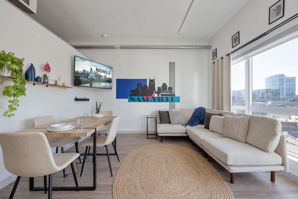 ★"I have stayed at numerous Airbnbs and Abby was the most responsive and friendliest host I’ve ever had!" ~Penthouse w/breathtaking city views ~Prime location in the heart of Downtown Nashville ~Perfect for special occasions or small groups (sleeps 4) ~Secure, reserved parking* ($25 nightly) ~Rooftop pool ~Lux workspaces+lounges ~Modern fitness center, yoga, & cycling studio ~Fully equipped/stocked kitchen 1 min→Music City Convention Center 5 mins→Broadway+Ryman 10 min→Nashville Airport/BNA ✈