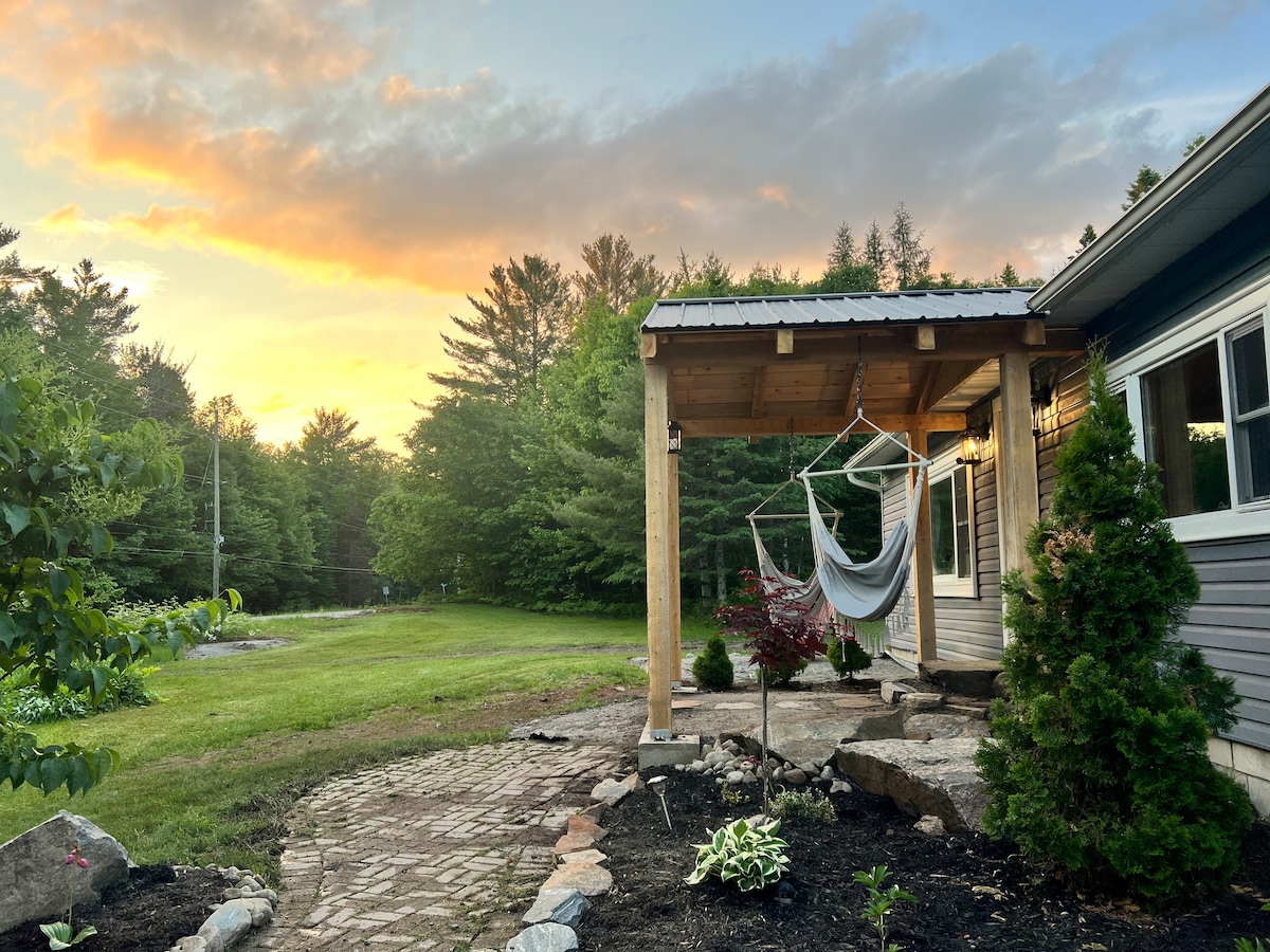 Kick back and relax in this stylish, beautiful, small 2/2 new home! Take an evening starlight walk along the river lane! See quaint dt Bracebridge. Stroll along the paved pathway around the Bay and over the Waterfalls! Visit the art galleries, the microbreweries, etc. Guests stay in the Windemere Suite or the Algonquin Rm, while an extra guest may stay in the Livingrm or Secret Loft. Enjoy your coffee from one of two porches or on the back. Please advise if you wish to use the kayaks!