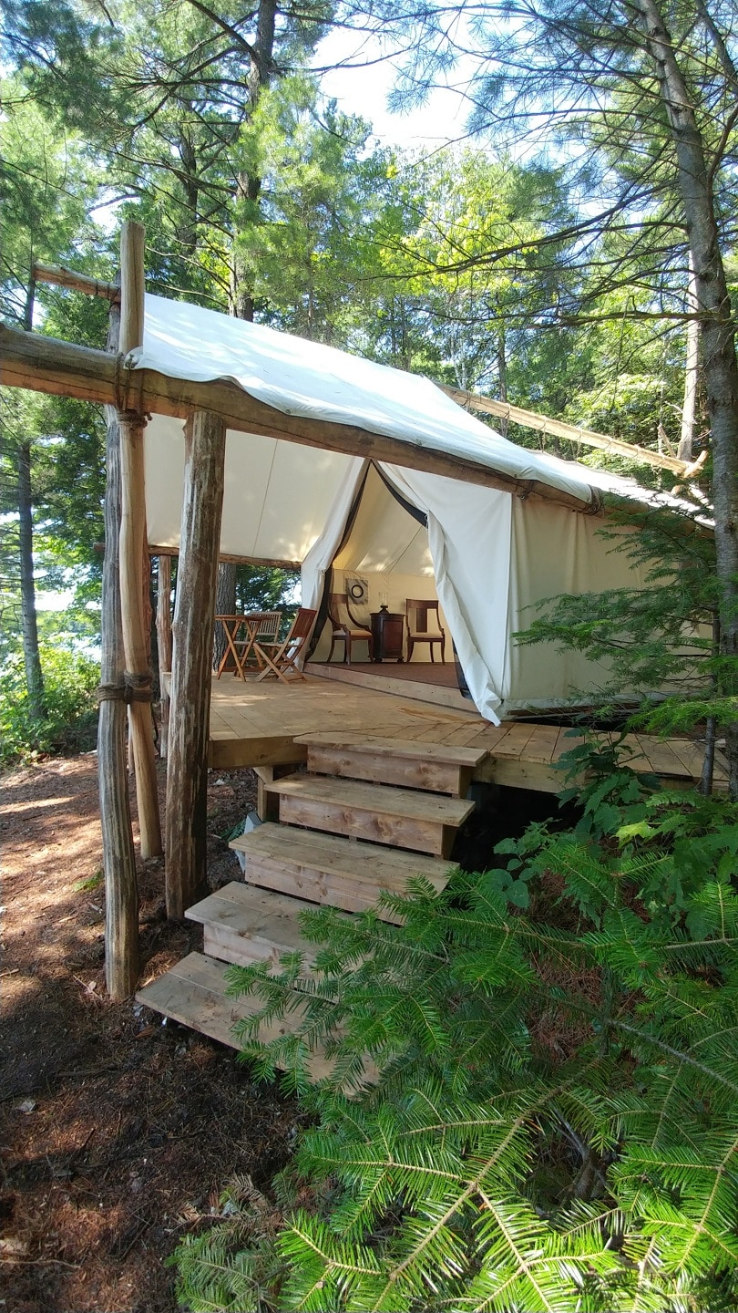 Waterfront Luxury camping at it's best. Sumptuous bed, bedding, table, chairs, etc., private on-suite washroom. . Explore our 100 Acre property. Private fire pit, deck and use of Canoe, kayaks and SUP's. If this Glamping site is not available for your dates we have 2 more sites. You will also have onsite access to ATV, Side by Side and Snowmobile tours.