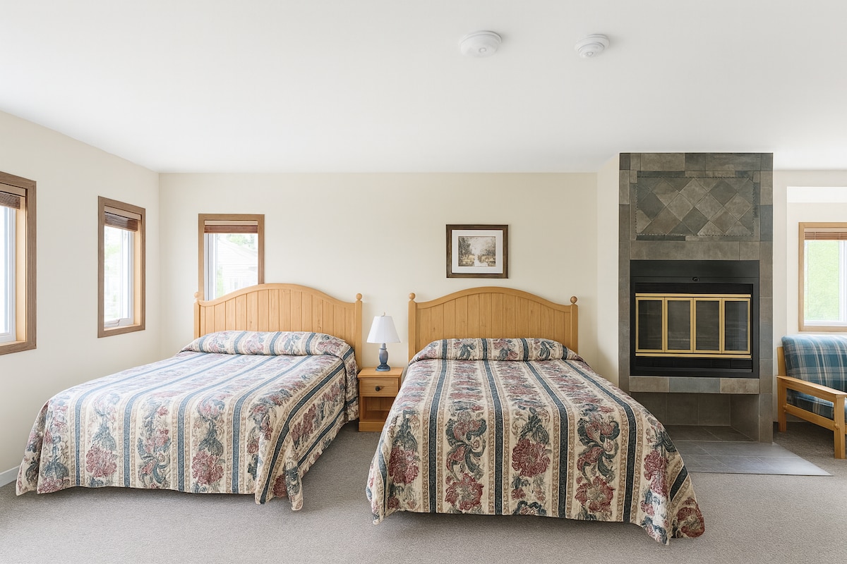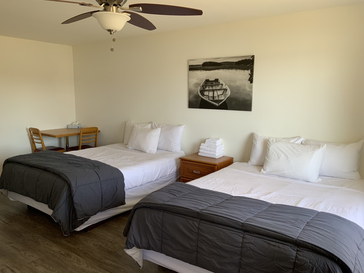 Sunrise 5: Enjoy a cozy, motel-style room featuring two queen beds, with a breathtaking view of the lake. The maximum occupancy is 4.