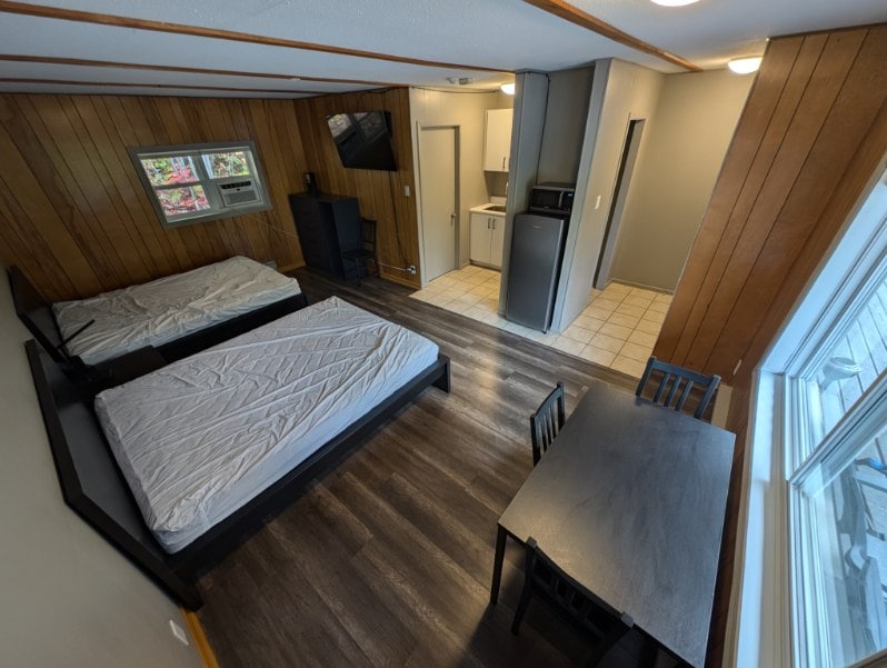 Charming Duplex Loft with Private Entrance and Full Hotel Amenities. 1min walk to Mary Lake/Beach Kitchenette incl. with a Microwave, Fridge, and Sink. Relax on your Private Patio or by our Cozy Fireplace. Access to Fire Pit, Patio, and On-site Restaurant as well as Lounge. This Spacious Loft Suite Accommodates 4 Adults with Two Bedrooms: 1 Private Double Bed and 1 Loft King Bed, plus a Comfortable Living Room. Guests can purchase a Sauna Pass on-site for available time slots after arrival.