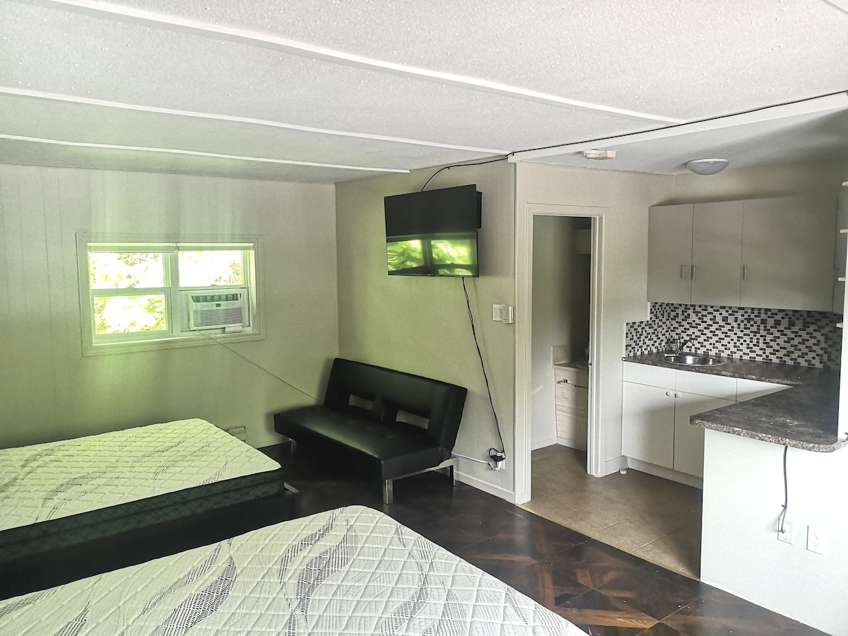 Just Minutes From The Lake and Boat Launch Firehouse Lodge Modern Walk out Deck Room, Full Bathroom, Queen Beds, Wifi, 50″ LED Satellite Tv, Fridge, Microwave, Kitchenette . Located on 8 Acres, on the property you will find lots to do, including Volleyball, Multiple Beautiful Trails, Fire Pits, Picnic Tables, Lounging Chairs and More! 1 Bedroom, 3 Bedrooms and 5 Bedroom waterfront cottages are also available. Booking options: Monday to Wednesday, Wednesday to Friday and Friday to Monday