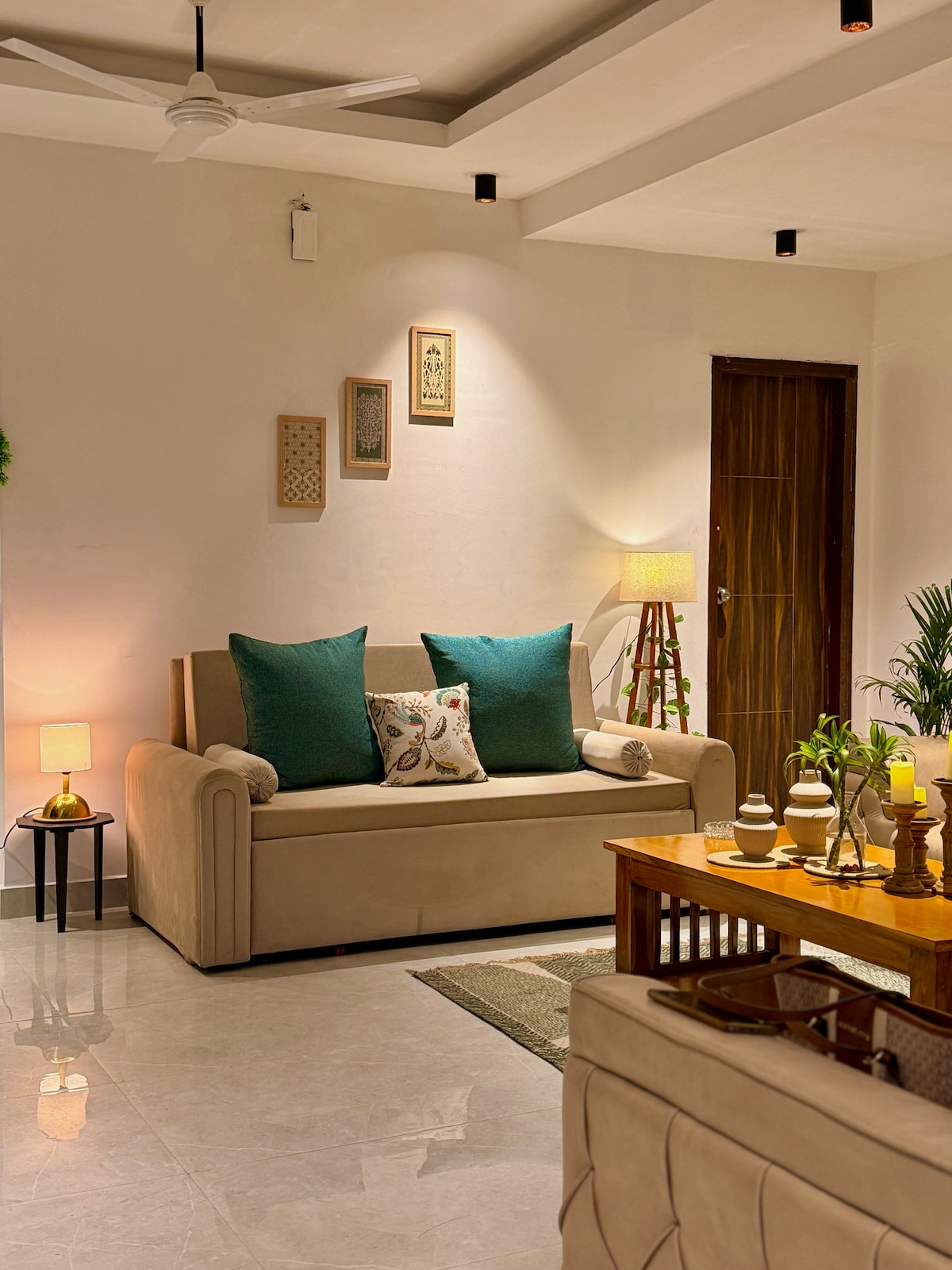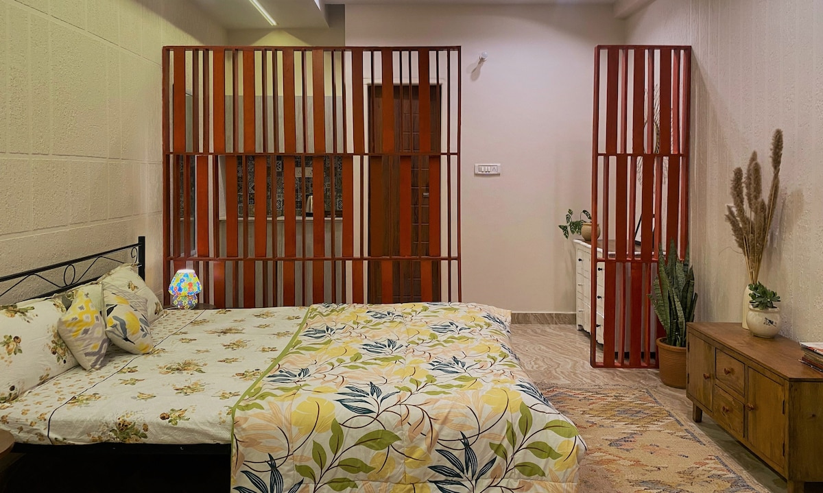 Experience luxury at our Mussoorie Road retreat. This designer home features two elegant bedrooms and two modern washrooms, perfectly blending boho-chic style with comfort. The spacious living area includes a versatile sofa-cum-bed, ideal for extra guests. Gaze at stunning mountain views through large windows that flood the space with natural light. With high-speed Wi-Fi, AC, and premium interiors, it’s the ultimate hilltop escape. Book now for a serene Himalayan stay!