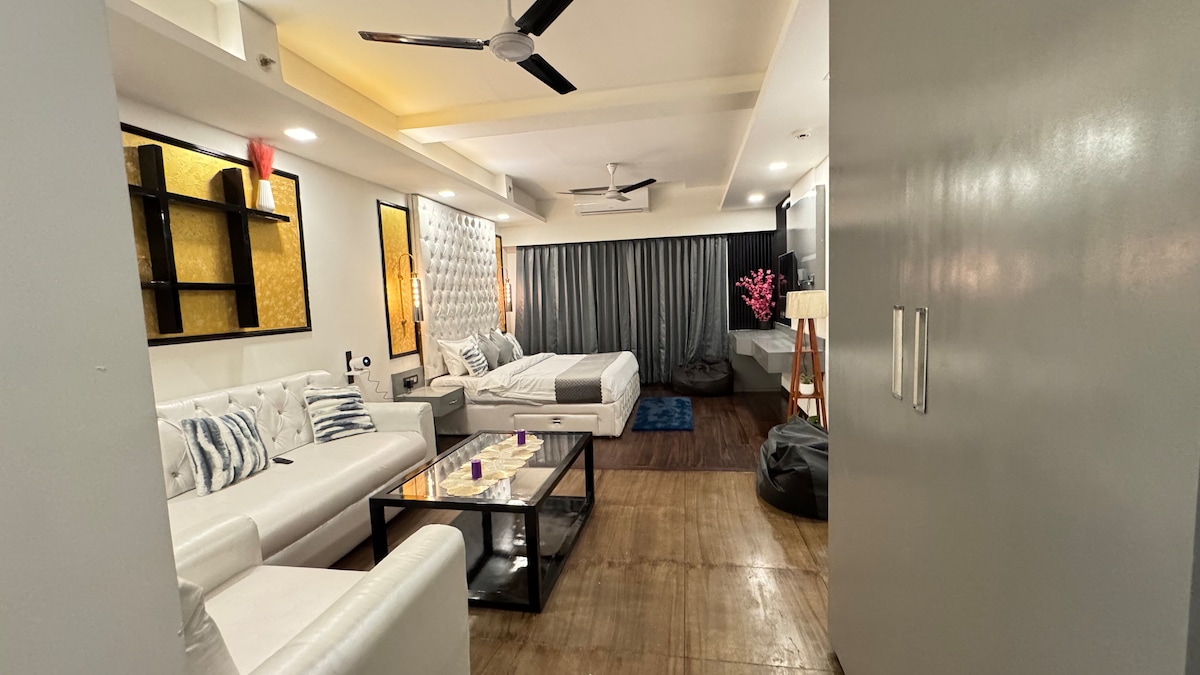Welcome to Melody by AariaHomez a stunning family friendly luxury apartment nestled in the heart of the mountains, perfect for a romantic getaway or solo adventure. The apartment is just 10 minutes from Pacific mall Rajpur road & 60 minutes from the queen of hills Mussorie. - Comfortable King size bed with premium linens - Offer a kitchenette for your cooking needs - Modern bathroom with essentials provided. - Private balcony to enjoy your morning coffee - Smart TV and High Speed Wi-Fi