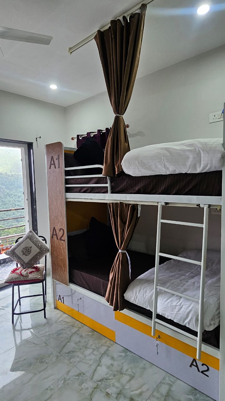 Experience a premium stay at Serenity Stay with AC rooms featuring a beautifully designed private balcony overlooking serene mountain views. Relax in stylish seating under an elegant arch, perfect for morning tea or sunset moments. The rooms are thoughtfully furnished for comfort and a refined feel. Ideal for families and groups seeking peace with a touch of luxury. Freshly prepared food is available on order for a complete, hassle-free stay.