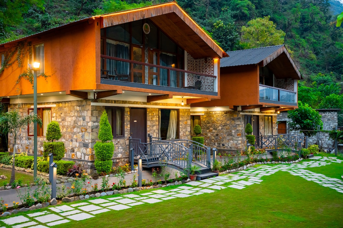 Set along a serene river at a peaceful, pet & senior-citizen friendly resort, this 2-bedroom suite features large glass windows and private balconies that frame picturesque river and mountain views. Outdoors, guests can unwind amid landscaped gardens, riverside seating, a gazebo, a cabana, and a shared pool with a dedicated kids’ pool. Delight in delicious meals at the on-site restro, which offers thoughtfully designed indoor & outdoor seating, ideal for intimate meals immersed in nature.