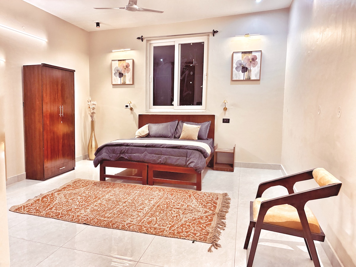 "Welcome to our tastefully curated homestay, where comfort meets style. Adorned with elegant panels, ambient studio lights, and a 55-inch TV, our space is designed for groups to unwind and relax peacefully. Please note, to ensure a peaceful environment for all guests, we kindly request lowering music by 10:30 PM, and we appreciate your understanding in refraining from loud noises thereafter.