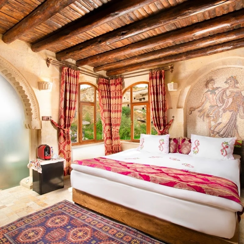 Seperately designed original cave rooms, with heating system and also A/C! Right in the heart of Göreme, surrounded by cafes, pubs, restaurants, shops and fairy chimneys! Have one of the best rooftops where we serve our breakfast and dinner with magnificent view of fairy chimneys and even covered by hot air balloons as all of them pass right above us in the mornings! We have our own restaurant that serves Indian and Turkish cuisine! We have a swimming pool where you can chill and relax!